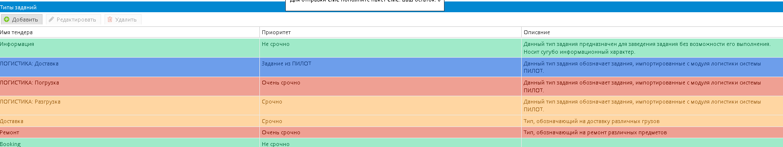 Tipos de tareas codificadas por colores según la importancia del estado.